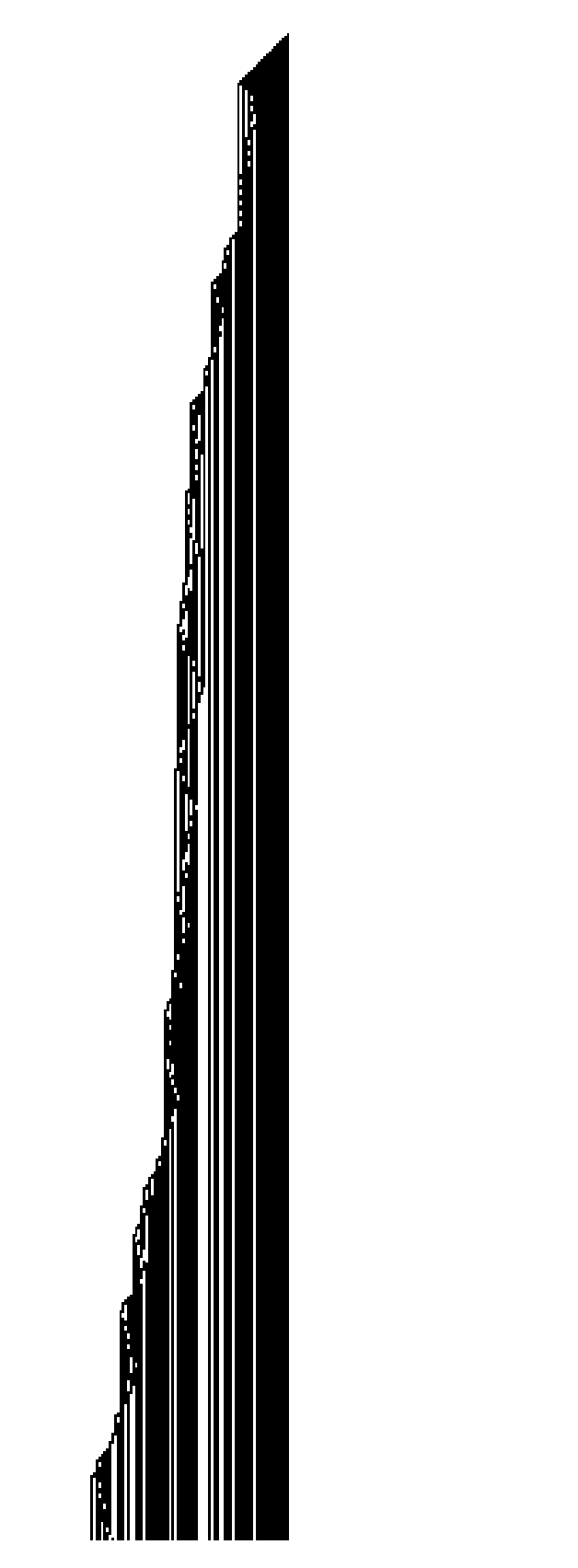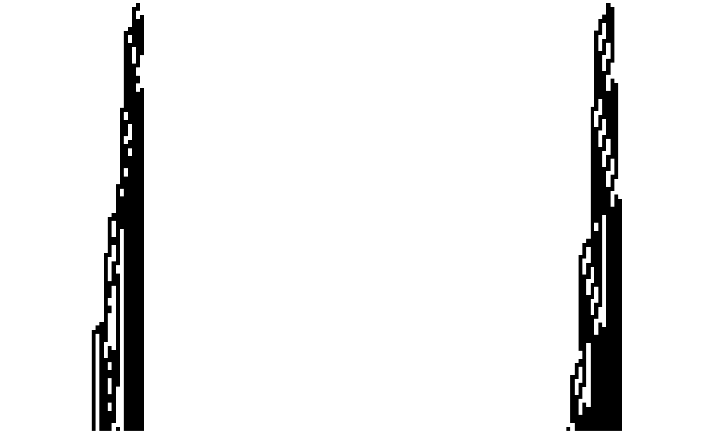 The following is a comparison between the tape development generated by $n = 371581$ (left - using Collatz’s Tape; to be described in a bit) and $\mathbf{BB(4)}$ (right - using the Turing Machine: 1RB1LB_1LA0LC_1RH1LD_1RD0RA