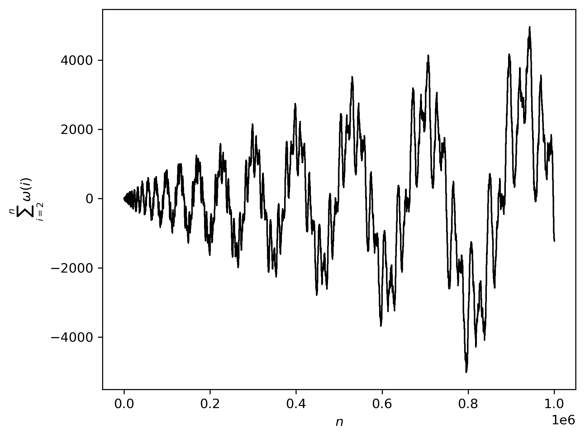 \[\omega(n) = \begin{cases} +1 & \text{if} \quad \tau \equiv 0 \quad (\text{mod}\, 2) \\ -1 & \text{if} \quad \tau \equiv 1 \quad (\text{mod}\, 2) \\ \end{cases}\]What should be the behaviour of $\sum_{i = 2}^{\infty} \omega(i)$? Consider it from $n = 2$ to $n = 10^6$:
